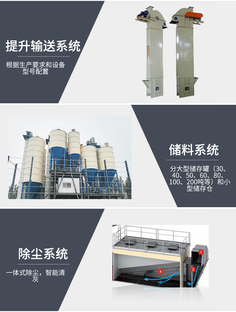 年產(chǎn)10萬噸干粉砂漿攪拌站建站方案主要由提升輸送系統(tǒng)、計(jì)量配料系統(tǒng)、混合系統(tǒng)、儲(chǔ)料系統(tǒng)、包裝系統(tǒng)、除塵系統(tǒng)、控制系統(tǒng)、鋼架平臺(tái)等組成。