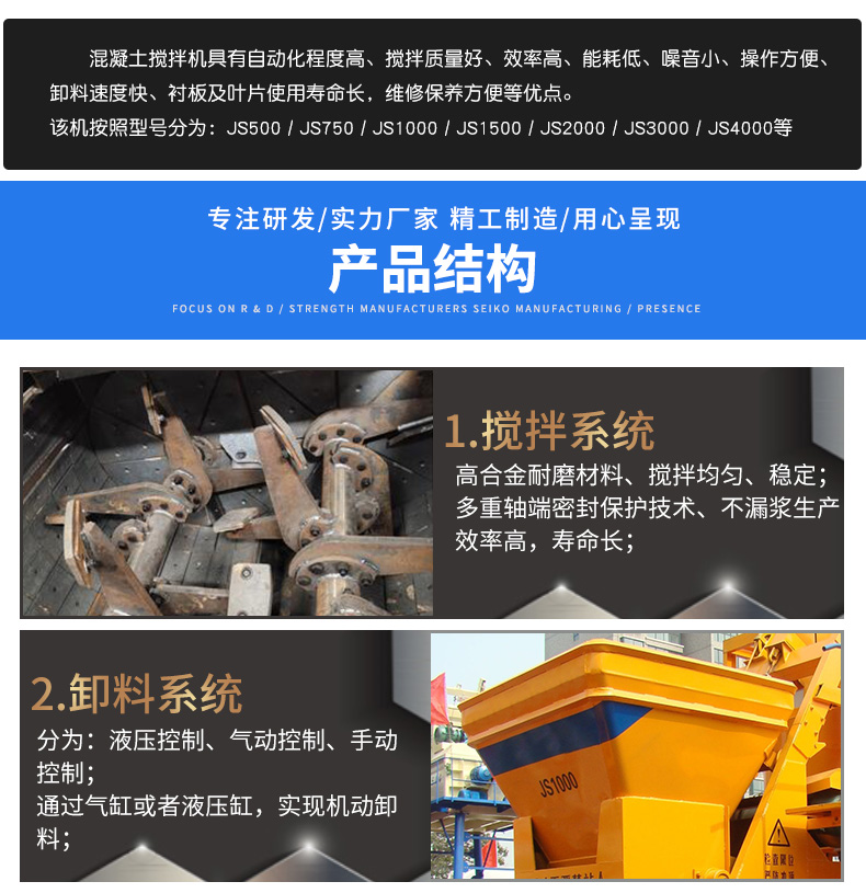 JS1000混凝土攪拌機每次出料1方,也稱為1方混凝土攪拌機,同時也是50攪拌站主機、60攪拌站主機,具有加水量控制方便,攪拌力大,用電量小,功率強勁,內置渦流攪拌機可防止物料結團結倉等優(yōu)點。 JS1000混凝土攪拌機適用于各類預制構件廠及水利、道路、橋梁等工業(yè)及民用建筑工程施工部門攪拌干硬性混凝土、流動性混凝土、輕骨料混凝土及各種砂漿。既可獨立作業(yè),又可與相應配料機組合成簡易攪拌站。